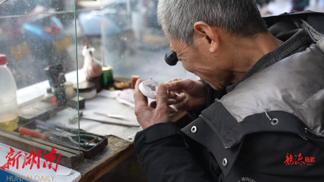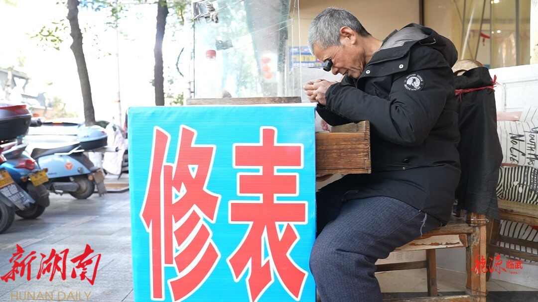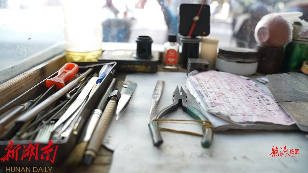 修表是一门精细活儿,既考验视力,又要求丰富的经验和非凡的耐心。唐双文手法娴熟,不到二十分钟便能完成配件更换。唐双文今年69岁,老家在衡阳祁东,从小在临武长大,他自小便与表结缘,1983年开始便在百货公司跟随师傅学习修表技艺,从机芯、表壳到字面,每一块表都蕴含着上百个微小零件,只有熟悉每一个部件才能在维修时找到症结所在。为了尽快掌握这门手艺,唐双文进行了无数次的拆装练习,三个月便掌握了技艺,开始了摆摊生涯。