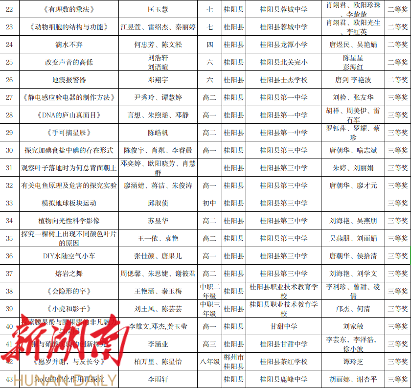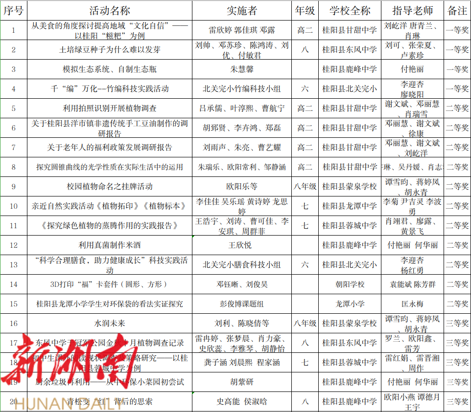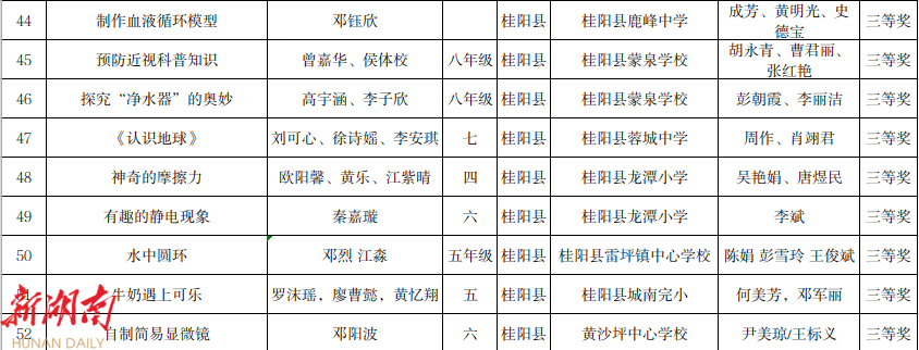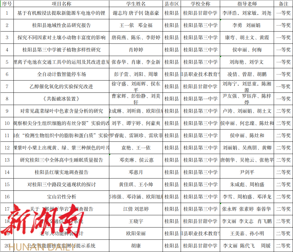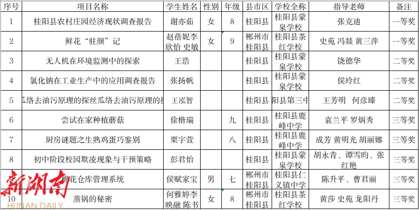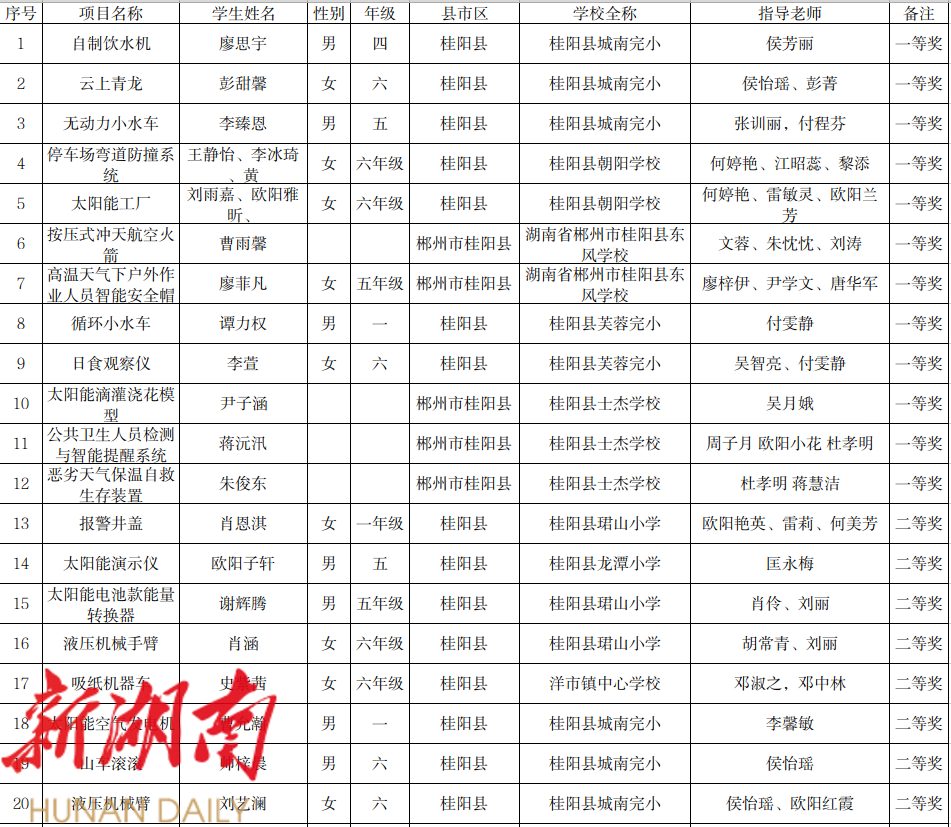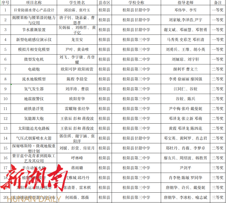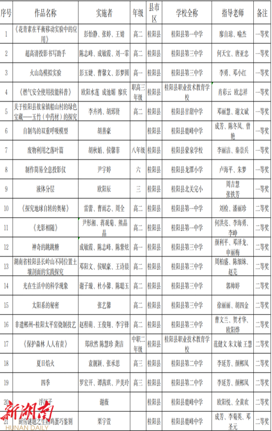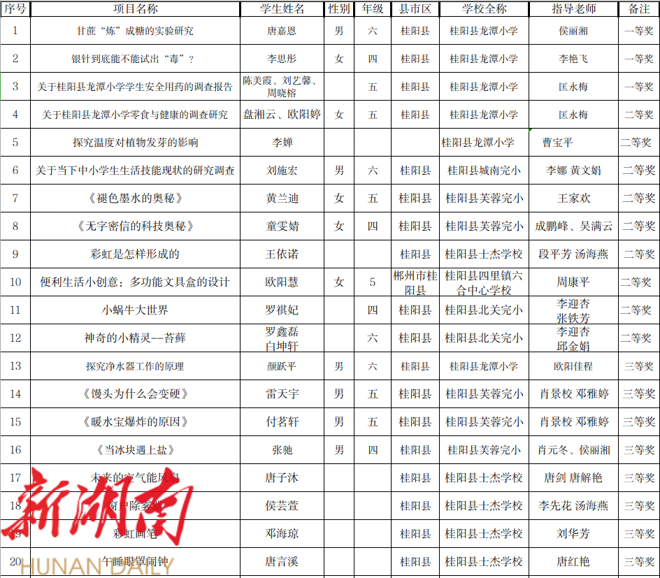 1、第20届桂阳县青少年科技创新大赛实践活动获奖名单