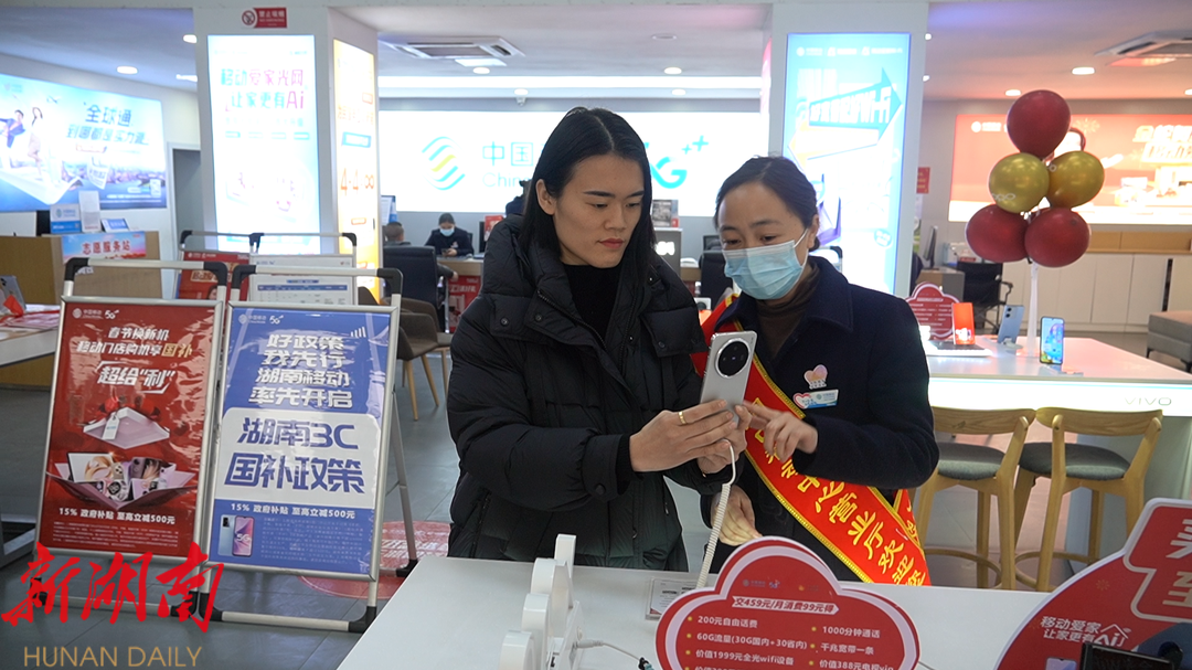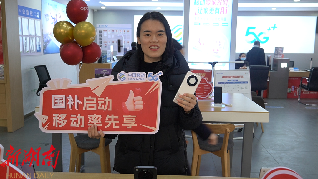 在洞口移动分公司营业厅,记者采访到刚刚购置了享受国补手机的顾客张女士,她高兴地说道:“手机作为日常的消耗品,过年之前我就想着换一部新的,没想到正好赶上国家出台了这个补贴政策,真的非常划算。”