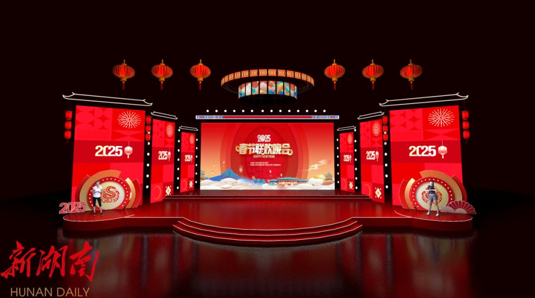 晚会将以线下演出+线上同步直播的方式进行,还设计了多轮抽奖环节,奖品多多,惊喜不断! 届时,将有一大波红包雨落向收看平江春晚的观众,分别是由鸿源凤鸣府赞助的40个166元现金红包、300元加油卡和20个888元现金红包。线上观众同样可以参与抽奖,请锁定我们的直播间。每位关注平江春晚的观众都有中奖机会! ▲2025年平江县春节联欢晚会舞台设计图