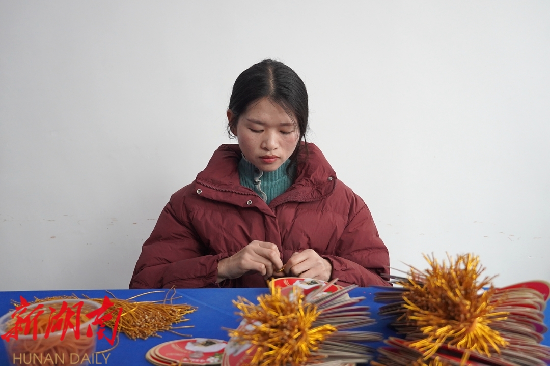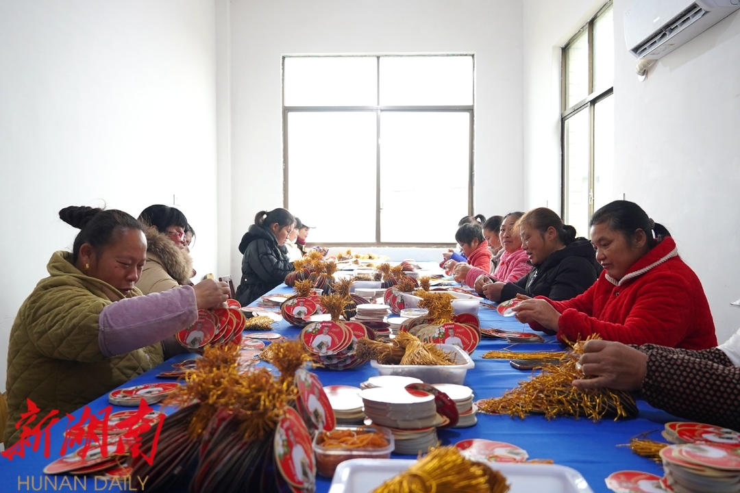 新春临近,湘阴县岭北镇合兴村的手工工作室里,几十名群众正在加班加点赶制订单。操作熟练,默契配合,阵阵欢声笑语从屋里传来,飞过田野,飞向村庄。