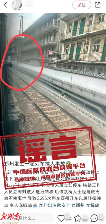 真相: 近日,网传“有人在郑州解放桥跳下被火车撞伤,导致列车晚点”。经核实,网传内容不实。郑州铁路站1月22日发布辟谣消息称,经核实:2025年1月21日14时32分,一男性下车旅客擅自从郑州站站台北端进入线路岔区由南至北行走,车站工作人员跟随劝说无效,紧急通知即将进站的G695次列车临时停车避让,未出现相撞和人员受伤 。随后相关部门将其控制并带离。经医院诊断,该男子被确诊为“精神障碍”疾病。(来源:“清朗河南”微信公众号、顶端新闻)
