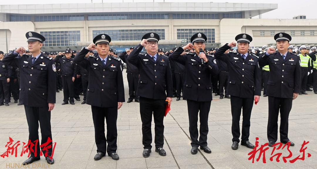 誓师现场,由市公安局机关单位、巡特警大队、城区三所、交警大队组成的方阵列队集结。200多名公安机关参战人员整装待发;巡逻摩托、防暴处突车等警种车辆组成的车辆方阵阵形严整。在夏立坤的带领下,全体人员紧握右拳庄严宣誓,展现了邵东公安以实际行动护航春节安保维稳的决心和信心。
