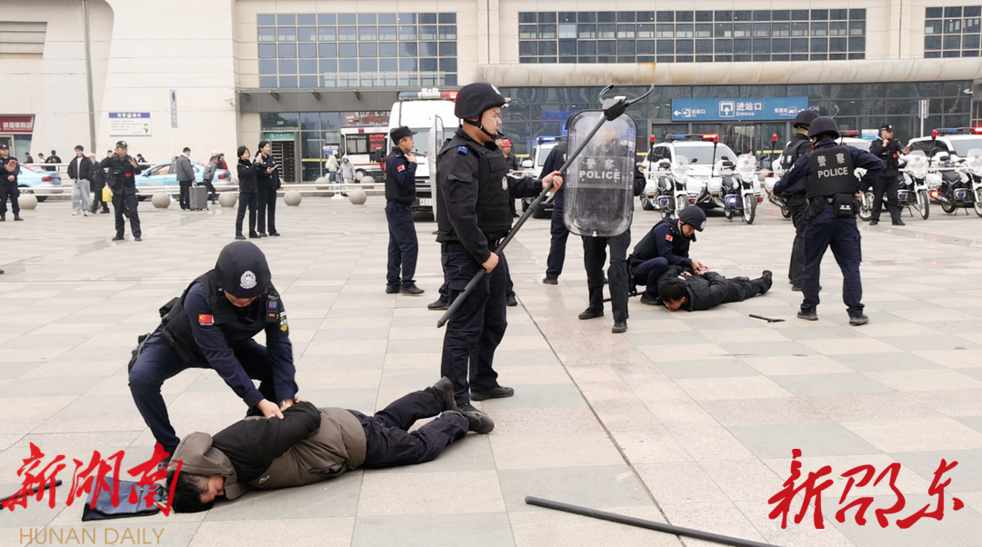 誓师大会结束后,现场还进行了反恐演练。在各参演单位的紧密协作下,模拟高铁站内的恐怖袭击危机迅速得到化解,3名“歹徒”被成功制服,演练取得预期效果,充分展现了邵东公安队伍强大的协同作战能力和专业素养,以实际行动彰显了邵东公安护航春节安全、守护群众平安的坚定决心。
