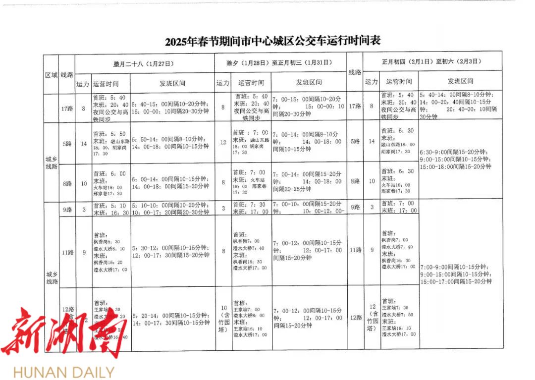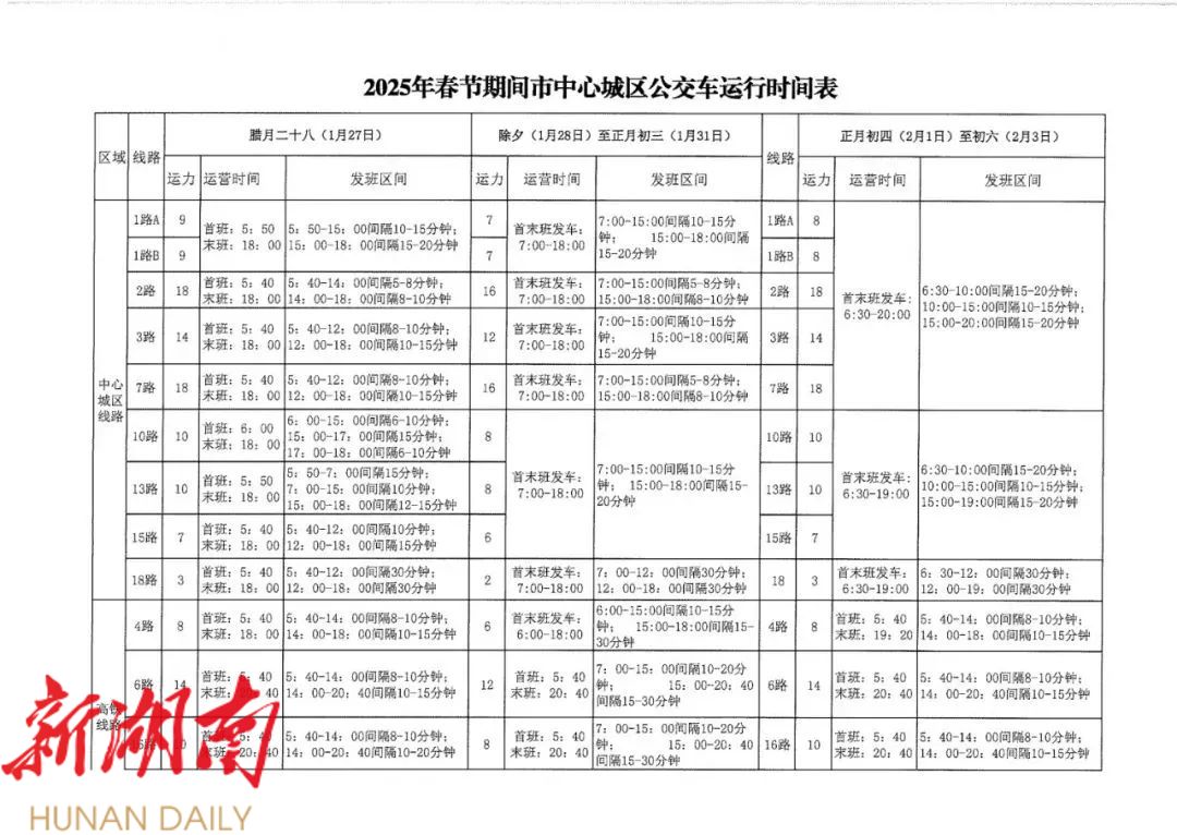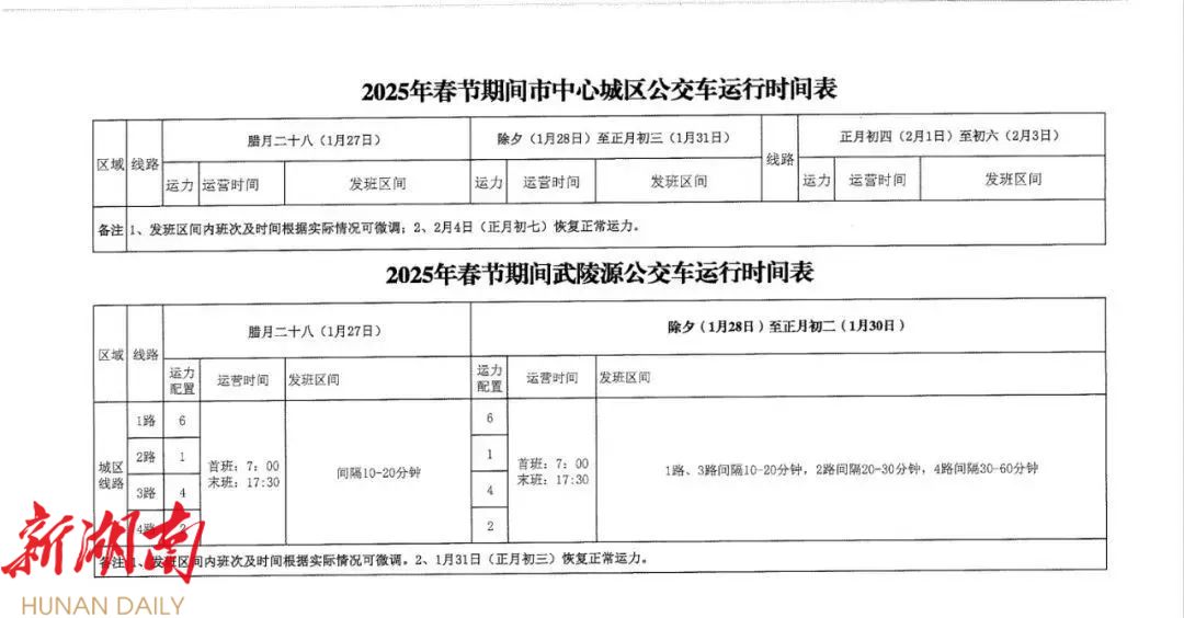为保障春节节假日期间市民的基本出行,经公司研究报主管部门同意,2025年1月27日(农历二十八)至2月3日(正月初六)我市城区(中心城区及武陵源城区)公交首末班时间、发车间隔临时调整(具体见附表),中心城区2月4日(正月初七)、武陵源城区1月31日(正月初三)恢复正常。请市民乘客自行规划好出行时间及线路。