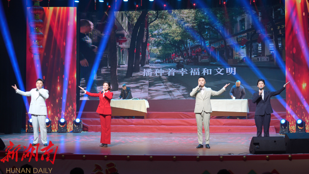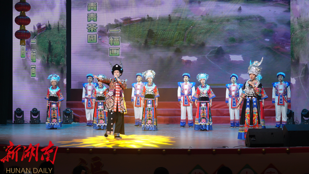 在“茶乡的祝福”篇章中,乐队现场表演改编版的《小背篓》,熟悉的旋律经过重新演绎,别有一番风味,唤起了人们对家乡记忆的回味;《八段锦》的表演,动作舒缓优雅,展现了茶乡人民对传统文化的传承与热爱;曲艺表演《说古丈·道茶乡》用生动的语言和独特的表演形式,讲述着古丈的风土人情和茶乡故事,让观众对这片土地有了更深刻的认识;女声独唱《给家捎个话》深情婉转,唱出了游子对家乡的深切思念与美好祝愿。