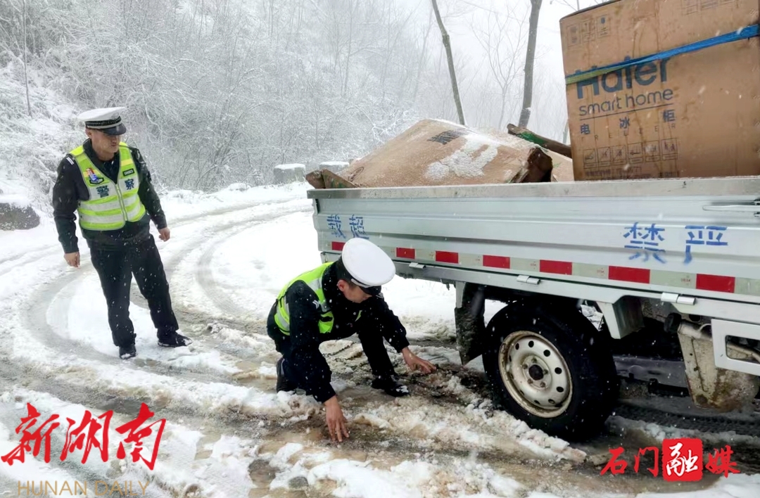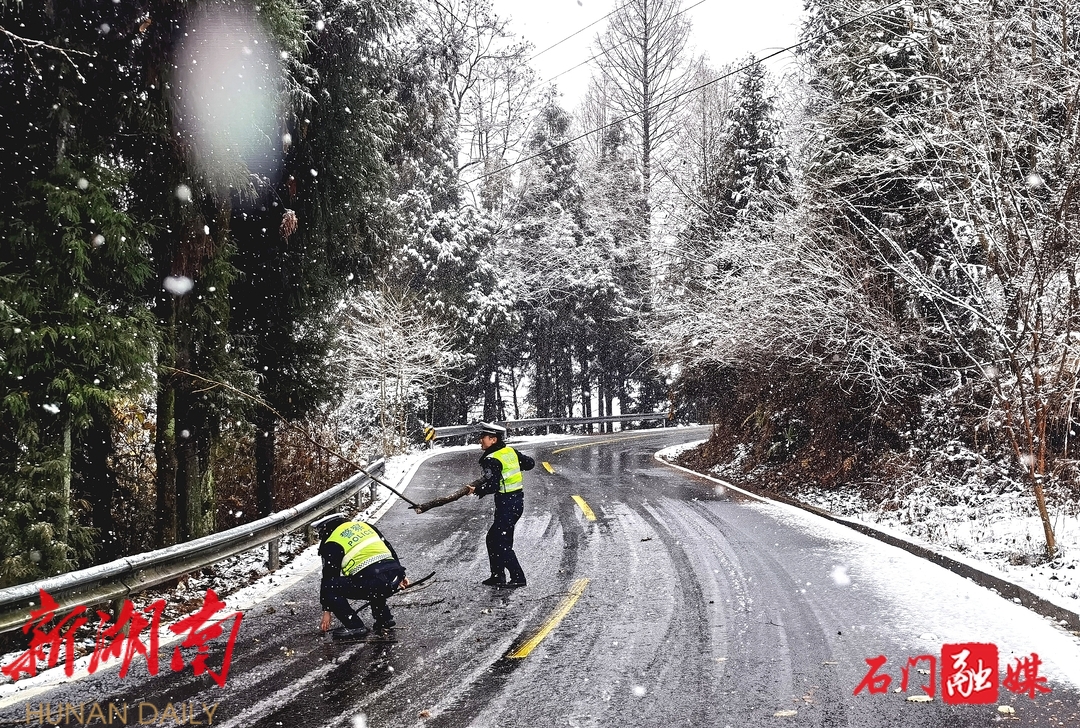 面对雪情,石门县公安局交警大队壶瓶山中队迅速响应,在降雪量较大的乡村集镇等重点路段,派警力维护路面秩序,指挥疏导交通,确保恶劣天气行车安全。