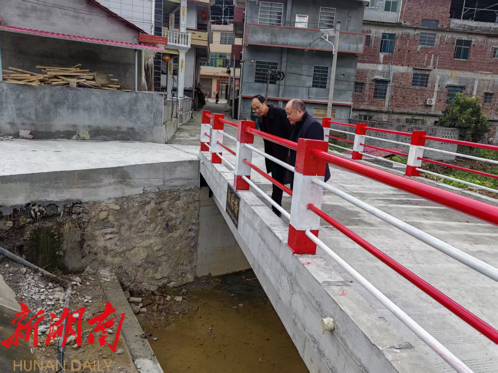 肖黎明首先顺着坎上村新江河仔细查看。2024年上半年洞口县普降暴雨,石柱镇境内出现多轮强降雨,导致坎上村新江河桥梁桥墩被冲毁,群众出行存在严重安全隐患。肖黎明指出,湘财证券捐款修建的“湘财桥”是石柱人民的“幸福桥”“致富桥”,切实解决了周边老百姓的日常出行和物资运送问题,要更加珍视其建设的价值和意义。