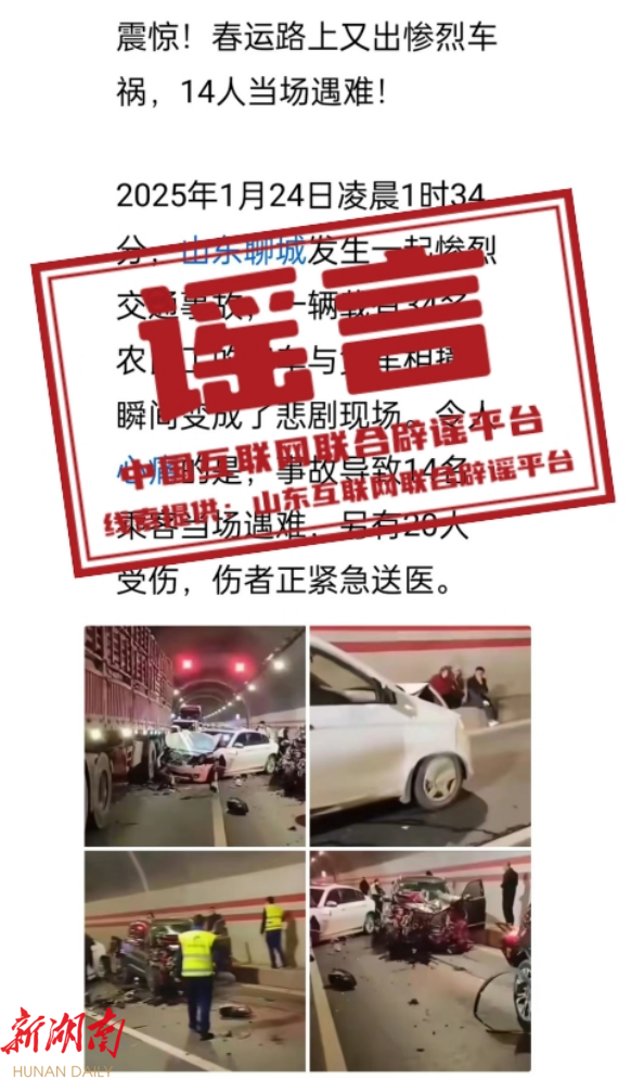 真相: 近日,有网民在网络平台发布一则“山东聊城一隧道内发生多车相撞”的信息,称“现场多车发生严重碰撞,场面惨烈,群众滞留”,引发关注。经当地警方核实,山东省聊城市从未发生过类似交通事故,该信息内容纯属虚假编造。经查,网民褚某某和韩某为博取关注、吸引流量,将外省市发生交通事故的图片视频移花接木,称“聊城发生交通事故”并凭空捏造伤亡人数,造成不良影响。目前,二人已被公安机关依法打击处理。(来源:山东互联网联合辟谣平台、聊城市网上辟谣平台)