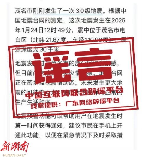 真相: 近日,一张“广东茂名电白区发生地震”的截图在网络上流传,引发关注。对此,广东省茂名市应急管理局相关负责人回应称,近期没有记录到茂名地区有地震发生,电白区发生地震消息为谣言。经社交媒体平台检索,网上流传的内容来自某AI搜索软件的回答。此信息中,发生震级、震源深度、震中经纬度均与数年前当地一次小型地震一致,疑似其断章取义编织而成。