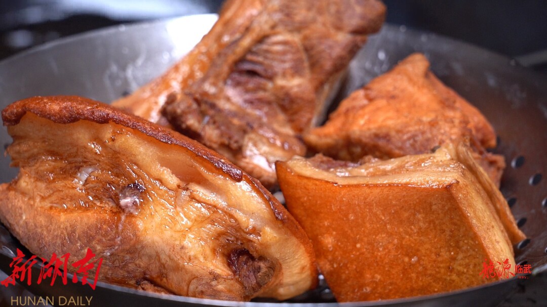 “做扣肉也可以,就这样煮着吃也没问题。在麦市这边,通常会把扣肉和豆腐一起焖煮,不管怎么做都好吃。以前我们做扣肉的时候,量多的时候能做一百多斤,今年做了八十斤,在正月里用来招待亲戚朋友。” 对于很多人来说,炸肉不仅是家乡的味道,更是过年时家家户户必不可少的美味。它象征着团圆和幸福,不仅仅是一道美食,更是一种文化的传承和情感的寄托。