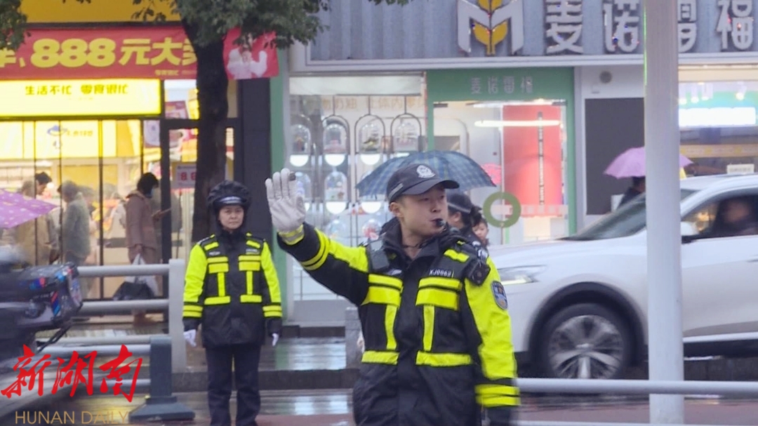 25日,农历腊月二十六,冷水江被连绵的雨幕笼罩着,道路湿滑,交通压力增大。在城市的各个交通要道,交警们如挺拔的青松,毅然坚守在雨中,为市民的出行安全保驾护航。