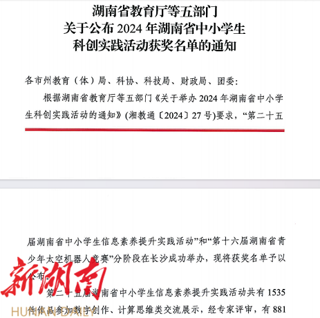 据悉,2024年举办的第二十五届湖南省中小学生信息素养提升实践活动,共有1535 件作品参加数字创作、计算思维类交流展示,经专家评审,有881件作品获奖,其中一等奖142件、二等奖288件、三等奖451件; 共有465支队伍参加科创实践、乐高教育类交流展示。经专家评审,有279支队伍获奖,其中一等奖47支、二等奖95支、三等奖137支。