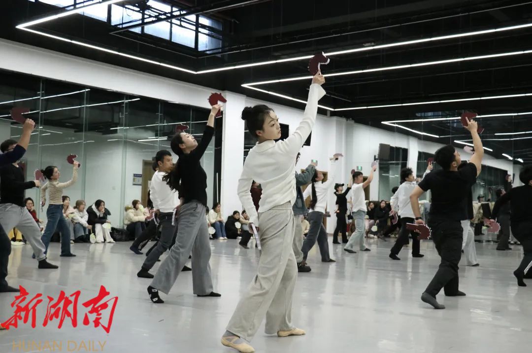 抬手、转身、跳跃……舞蹈演员们在永定区文化馆老师的指导下反复练习。从基础的舞步到复杂的队形变换,每一个动作都力求精准。老师穿梭在演员之间,一边亲自示范,一边细致讲解:“这个动作要轻盈,注意身体的协调性。”