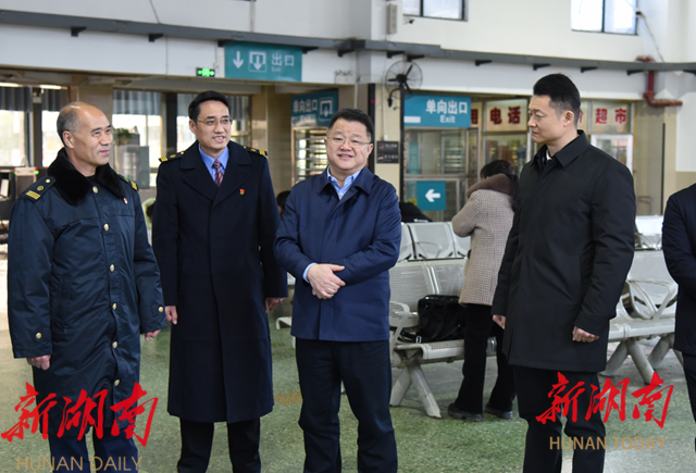 在新化火车站,李铁雄一行来到候车大厅,与车站负责同志交谈,了解春运期间各项工作情况以及旅客流量。李铁雄希望车站工作人员在春运期间坚守好岗位,严格落实春运工作要求,进一步提升服务水平,优化服务流程,展示新化形象,让来往旅客感受到有序、温暖、温馨。