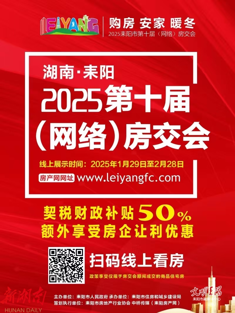 为全面贯彻省住建厅决策部署,经市委市政府决定,定于2025年1月29日至2月28日(为期31天)于线上耒阳房产网www.leiyangfc.com开设“房产超市”,举办耒阳市第十届房交会(网络房交会)。