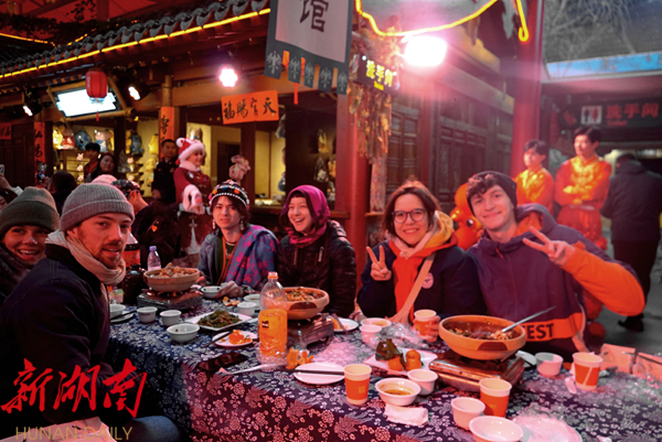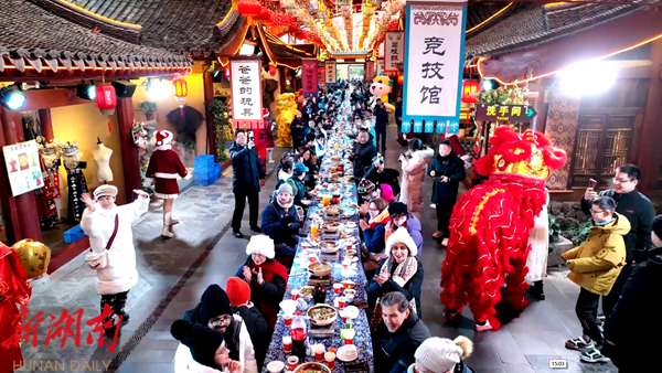 当天,百米长龙宴过赶年活动在张家界千古情景区美味开席,五百余名海内外游客欢聚一堂,感受纯正的土家年味。随着一声响亮的土家号子,长龙宴正式拉开帷幕。一道道色香味俱佳的土家美食被端上餐桌,腊味合蒸、土家三下锅、湘西牛肉火锅等特色菜肴香气扑鼻,游客们大快朵颐,纷纷拿起手机拍照留念。在品尝美食的同时,意大利歌曲《Ouanto è bella》以及《新春快闪秀》《锅庄狂欢》《嘀格儿调》等具有浓郁地方特色的节目轮番上演。现场的游客被深深吸引,不时爆发出热烈的掌声和欢呼声。一些游客还跟着演员们一起学起了摆手舞,现场气氛十分活跃。