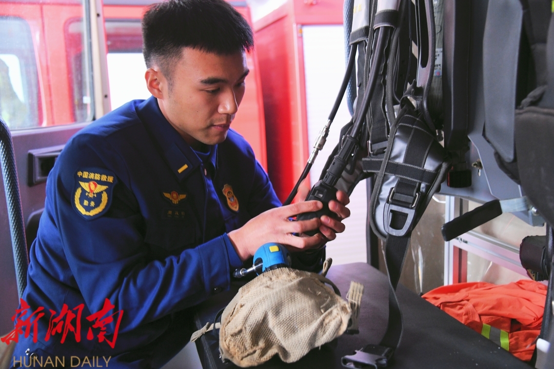 而在湘阴县洋沙湖大道消防救援站,消防新兵周政钧和其他队友正对车辆器材进行细致检查。“维护保养装备器材是队里每天的‘必修课’,要想完美的完成每一场灭火救援处置,需要时刻保持装备器材的完整好用。”周政钧说。