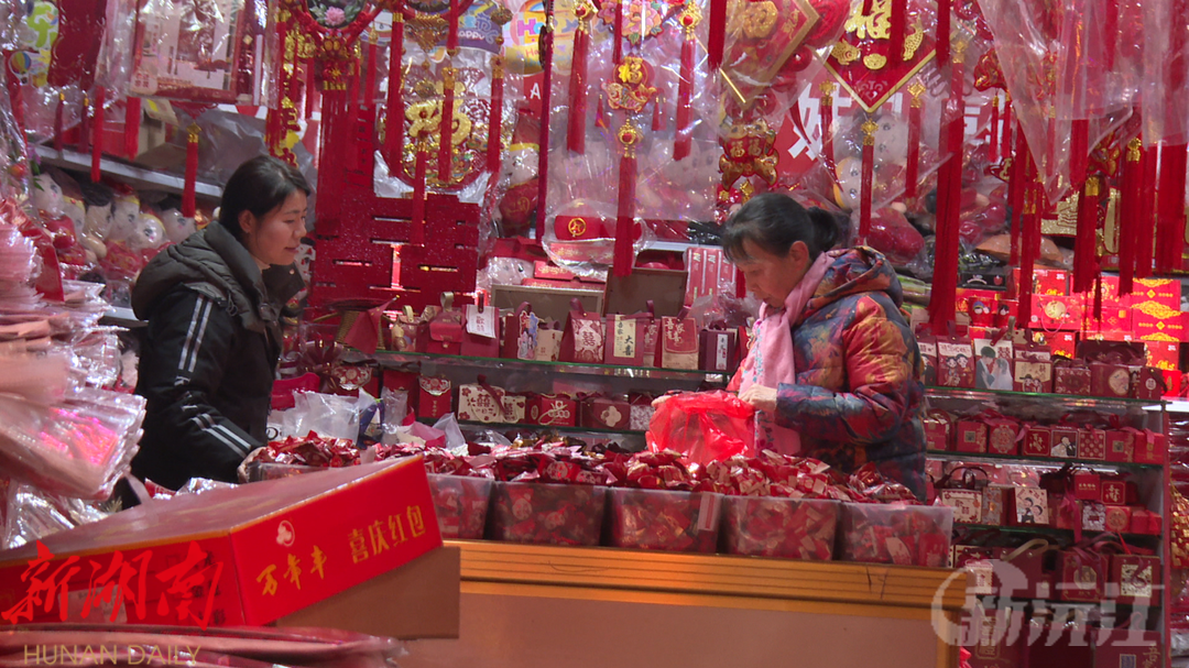 在湘北市场门口,一排排红彤彤的对联摊位格外引人注目。商家们精心筹备,从蛇年生肖节庆用品到春联、灯笼、挂饰等新春装饰品一应俱全,吸引了众多顾客驻足挑选。顾客们手中拿着精心挑选的对联,脸上洋溢着幸福的笑容,浓浓的春节氛围在此处蔓延,消费热度也不断攀升。市民伍世华表示:“今年的年货比往年还要丰富些,数量也多,也不贵。” 市民郭佳也说道:“外地的人都回来了,市场上人山人海,很热闹,年货非常多,种类也很多。”