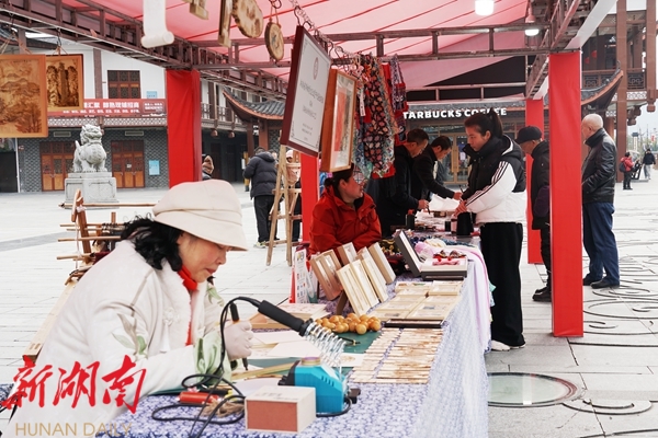 上午9时,标志门广场上,文艺舞台准时开启。苗族伞舞、侗族祝酒歌等极具民族特色的节目轮番上演。表演者们身着绚丽多彩的民族服饰,用优美的舞姿和动人的歌声传递着新春的祝福,赢得台下观众的阵阵掌声和喝彩。现场还设置了非遗展示区,烙铁画、拓印等非遗手工艺品和传统技艺吸引了众多游客驻足观赏和体验。