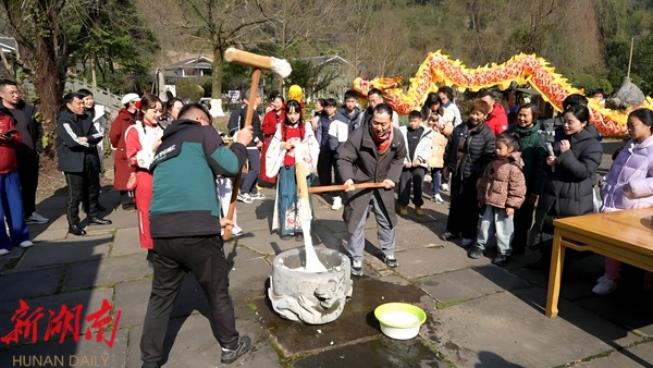上午10时,别样的精彩在黄龙洞景区接续不断。小朋友们化身 “小老板”,用稚嫩的叫卖声为景区增添了不少童趣与活力。舞龙灯、打糍粑、爆米花等活动也在有序进行,让游客全方位感受传统年味。韩国游客李先生一边吃着自己亲手打的糍粑一边夸赞:“我是带着母亲来张家界游玩,春节的黄龙洞另有风味,很值得来!”
