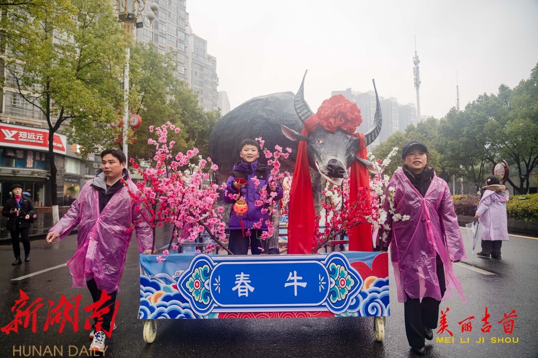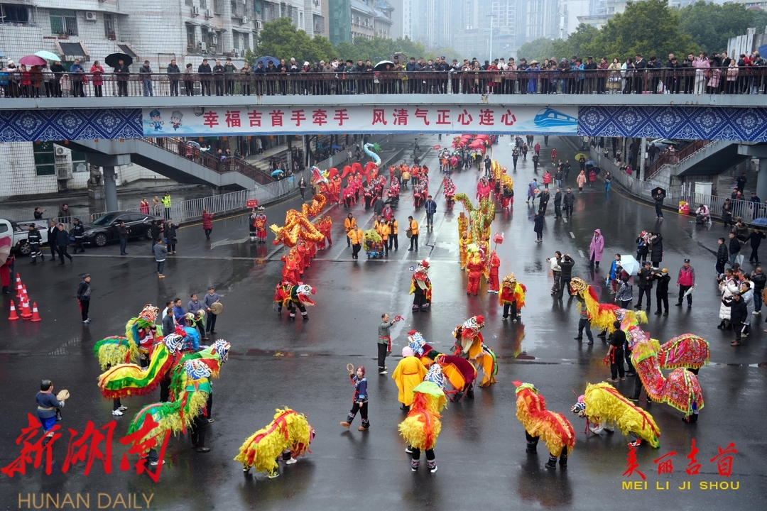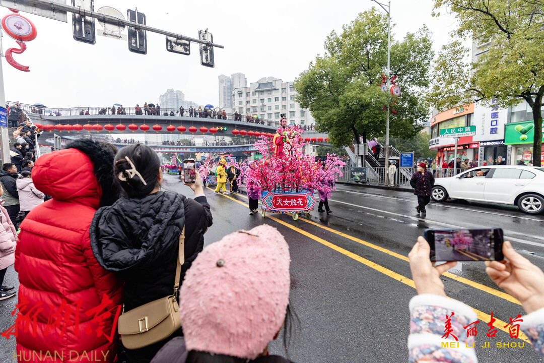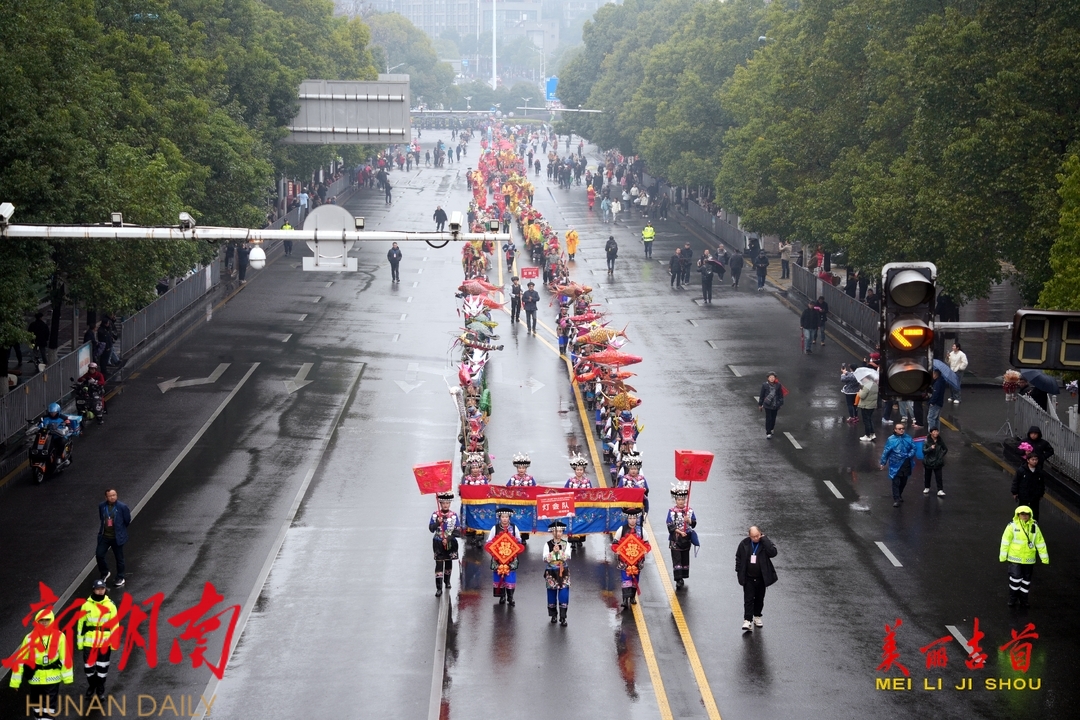 下雨难挡热情,一大早锣鼓喧天,乾州灯会队、土家摆手舞队、苗族接龙舞队、苗族鼓舞队、湘西阳戏队、舞龙队、舞狮队等15支队伍在“报子”、“春官”、“春姑”等人的带领下依次排好长队,开始巡游。各方阵队伍一边巡演一边与市民游客欢乐互动,不仅营造了喜庆、祥和的节日氛围,也让传统文化在节庆活动中不断创新传承与发展。