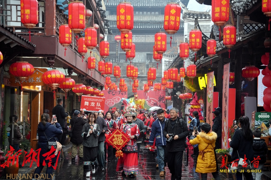 1月31日农历正月初三,“乙巳春节 相约湘西” 武陵山区(湘西)土家族苗族文化生态保护区非遗春节系列活动“乾州春会”热闹上演,15支队伍6台“春”品50盏灯组成绵延千米的长龙,热闹地穿梭于吉首市的街巷,为市民游客送上春节祝福。