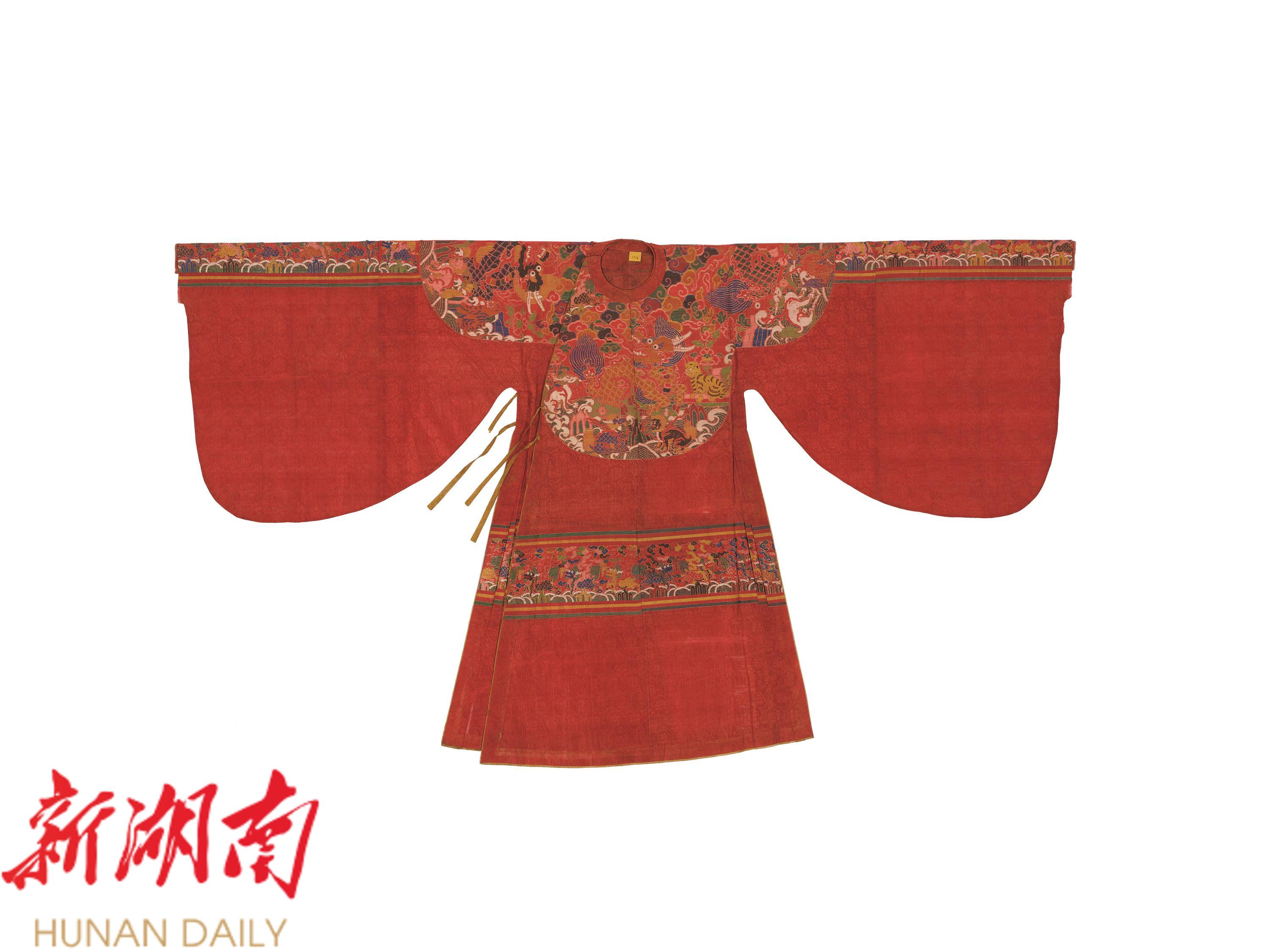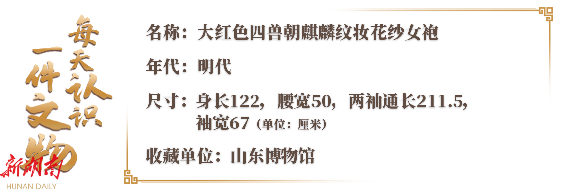 这件大红色四兽朝麒麟纹妆花纱女袍