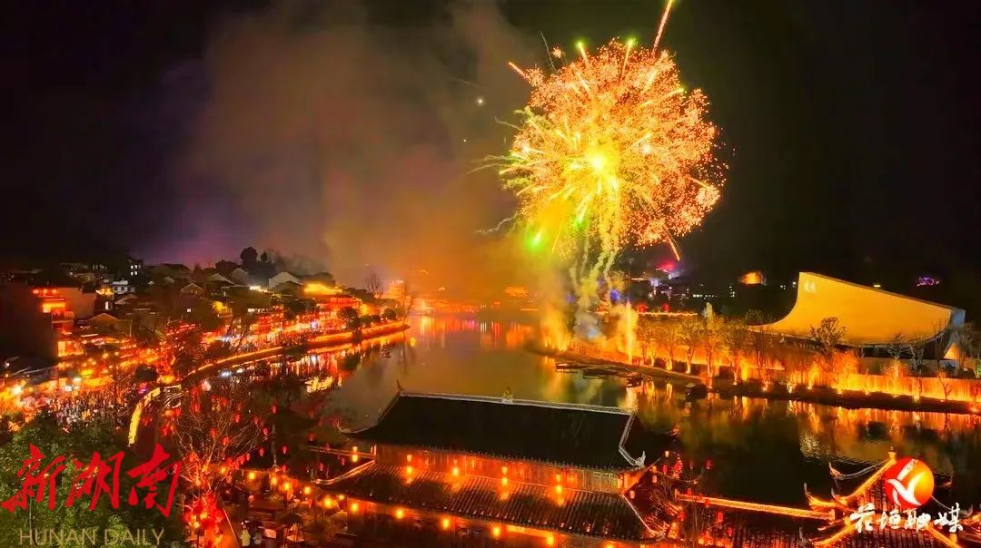 2月2日,农历大年初五,沈从文先生笔下《边城》原型地——茶峒古镇处处张灯结彩,热闹非凡。烟花秀、鱼灯巡游、火壶表演和打铁花等盛大民俗活动激情上演,吸引了数千名游客和当地居民共赴这场新春之约,共度欢乐祥和的传统佳节。