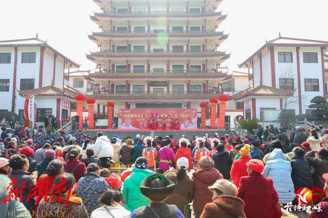 2月4日,农历正月初七,花垣县图书馆前坪张灯结彩,人头攒动,锣鼓喧天。神秘湘西过大年——“金蛇献瑞 同欢新春”2025年花垣县春节系列群众文化活动正浓情上演。