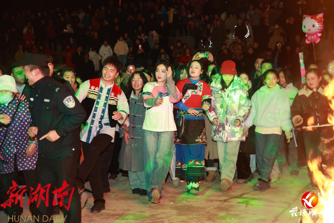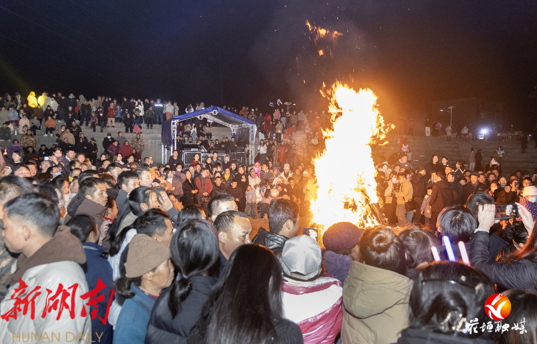 夜色渐浓,当苗歌的尾音逐渐被鼎沸的人声淹没,熊熊的篝火燃起,映红了人们的笑脸,大家围着象征欢乐的篝火,手拉手、肩并肩,跳起团圆舞。