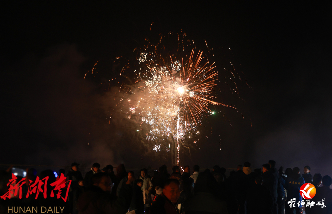 绚丽的烟火也在此时骤然冲向夜空,“嘭”“嘭”的声响将人们的目光引向天际,璀璨的烟火如盛开的花朵般肆意绽放。烟火下,围观的人群带着美好的祝愿,共同走进又一个生机勃勃的春天。
