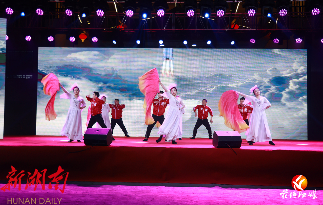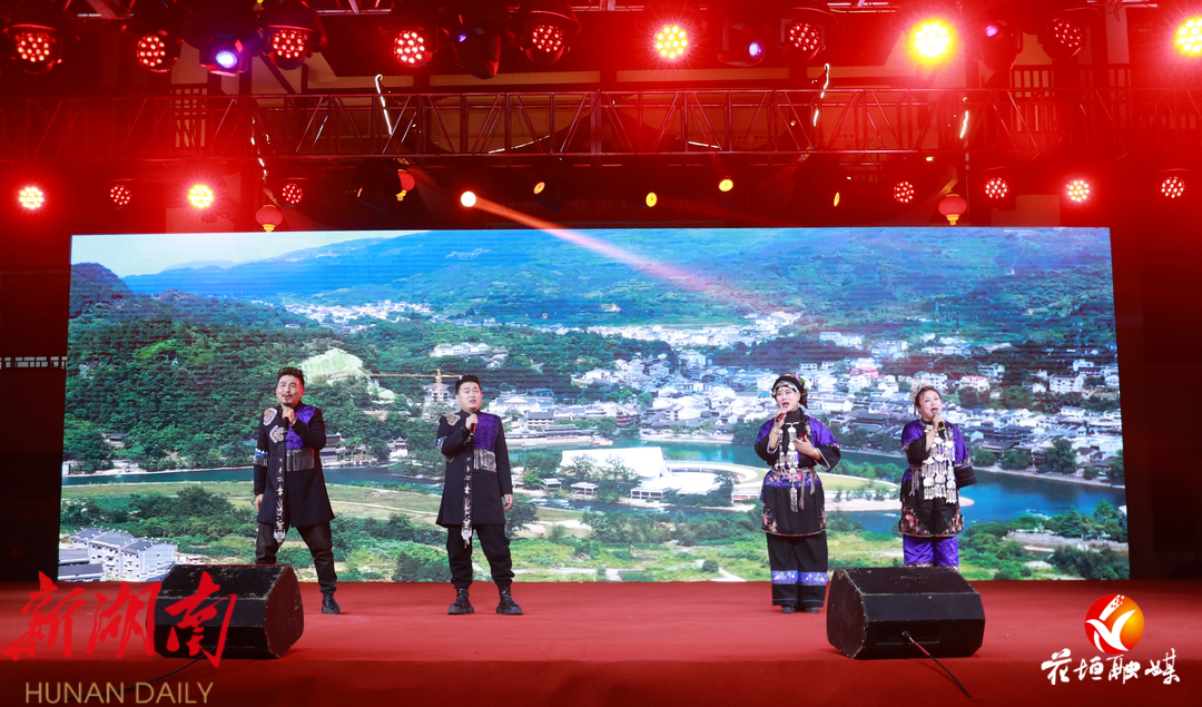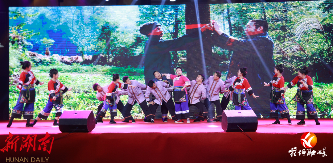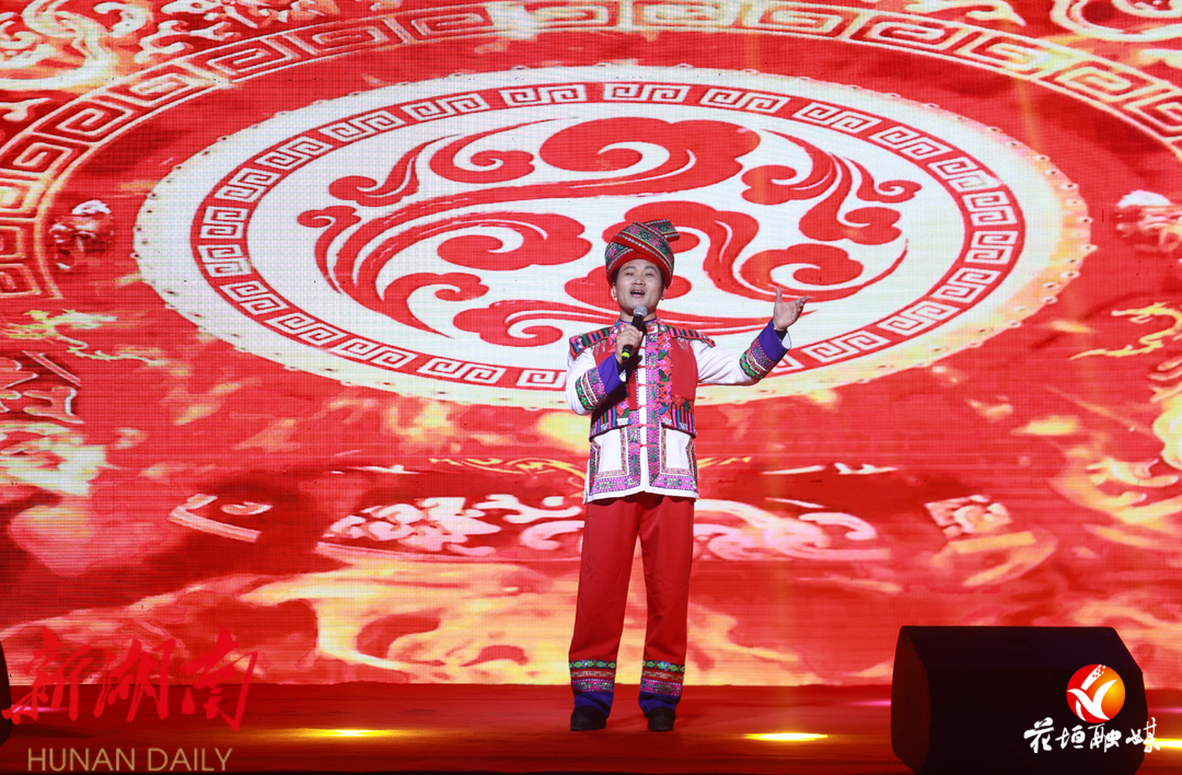 《湘西处处喜事多》欢快开场之后,精彩节目便轮番上演。《苗家酒歌》《苗岭飞出幸福歌》演唱刚结束,情景歌舞《乡村振兴舞起来》便登上舞台;《苗山韵》《变脸》《乡情》《风吹麦浪》《苗山鼓》《山歌唱出好兆头》送上视听盛宴,一场别开生面的情景歌舞《偷梁乐》又把氛围推向了高潮……