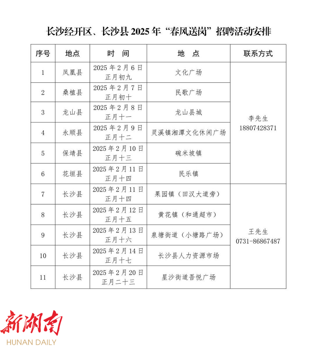 “春风送岗”招聘活动11期(湘西自治州6场、长沙县5场)。敬请关注!