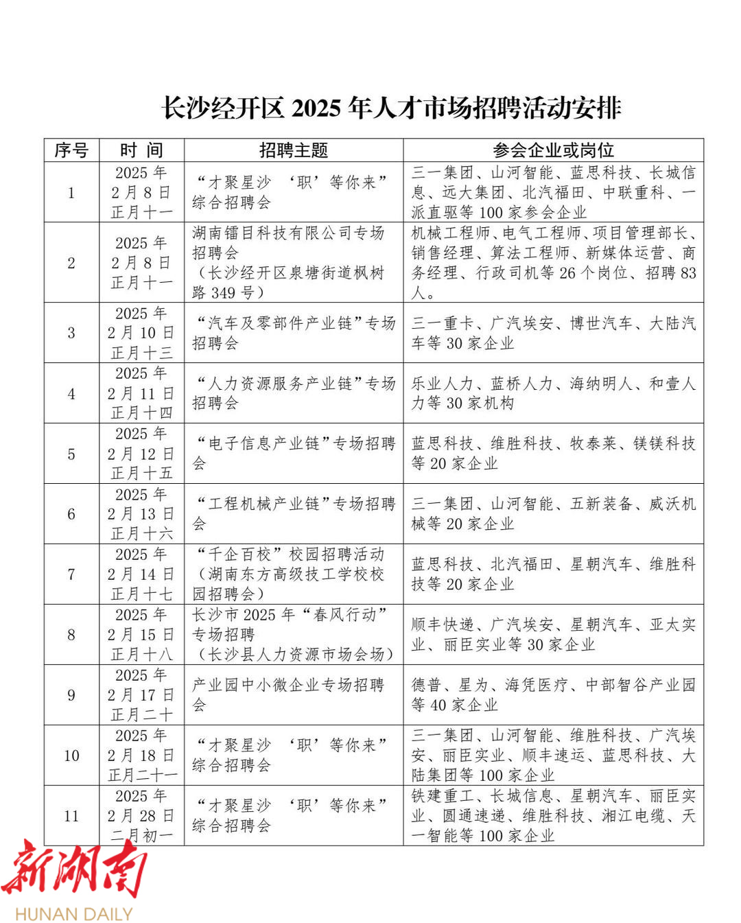 随着园区企业相继复工复产,用工需求与日俱增。节前,长沙经开区管委会干部人事人才局经全面摸底梳理,汇总形成了园区企业2025年一季度人才需求目录(见附件),并安排了“新春招聘月”一系列招聘活动,全力保障企业用工需求。