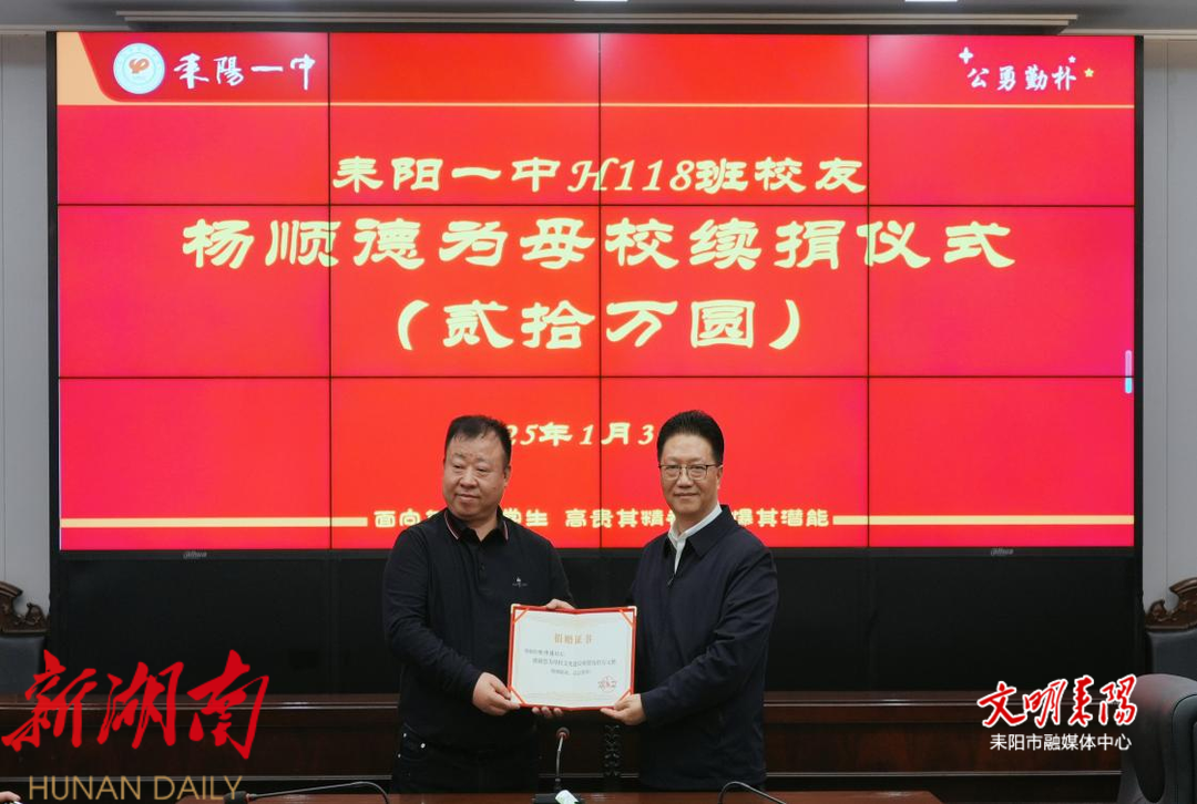 近日,广州多满分集团董事长、耒阳一中H118班校友杨顺德为母校续捐,累计捐资达50万元。