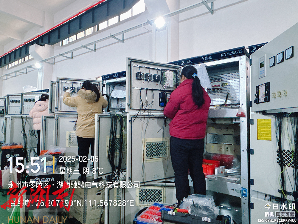 零陵高新区的湖南驰骋电气科技有限公司建有3条高低压智能电力设备生产线,是国家电网、南方电网的重要合作伙伴。新春开工以来,工人们正精神抖擞,生产线旁机器轰鸣,叮叮当当的碰撞声奏响了新春奋进的乐章,一派繁忙景象,一台台崭新的高标准产品下线上市,承载着新春的美好祈愿奔赴全国各地。