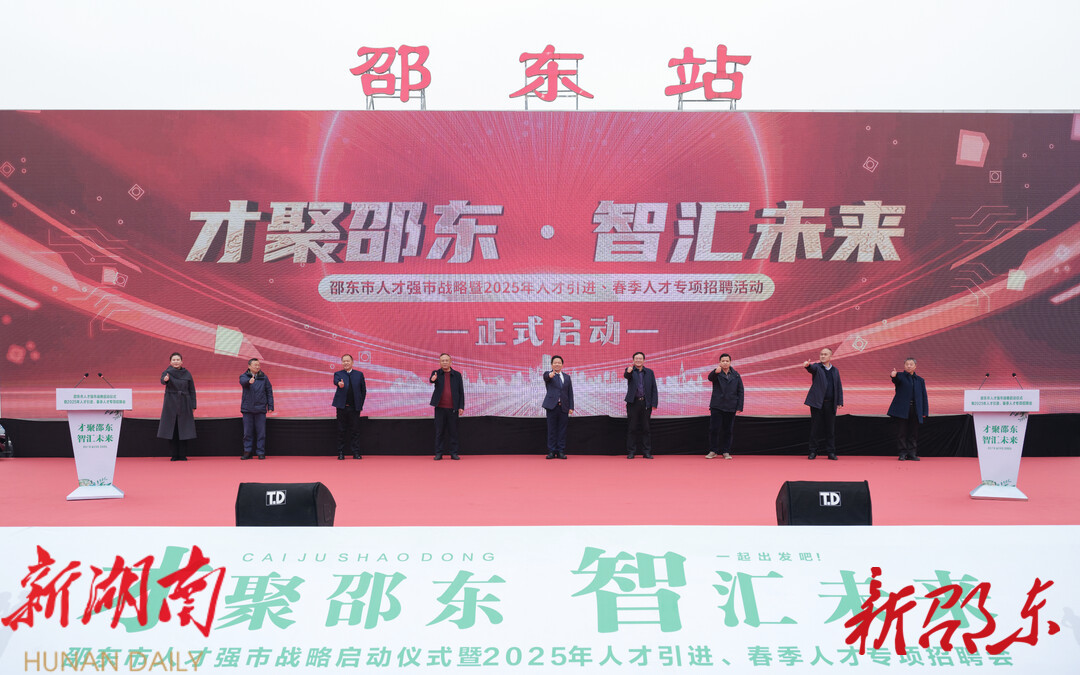新邵东客户端2月6日讯(记者 张平华 邓远 通讯员 赵文雅 卿蕾蕾 刘海) 2月6日,“才聚邵东·智汇未来”邵东市人才强市战略启动仪式暨2025年人才引进、春季人才专项招聘活动在邵东高铁站站前广场启动。邵东市委书记李国军、邵阳市人才发展中心主任肖锋及邵东市领导黄负平、罗健康、周剑锋、唐志军、曾铁钧、李和平等出席。