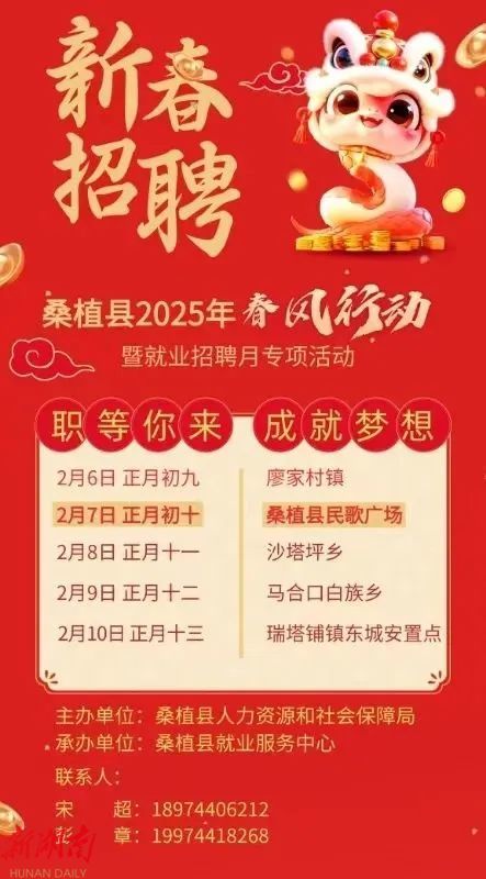 桑植县就业服务中心负责人表示,除了本次廖家村镇专场招聘会外,2月7日至2月10日,将相继在民歌广场、沙塔坪乡、马合口白族乡、瑞塔铺镇东城安置点开展四场招聘活动,为企业和求职者“牵线搭桥”,助力企业招贤纳才。