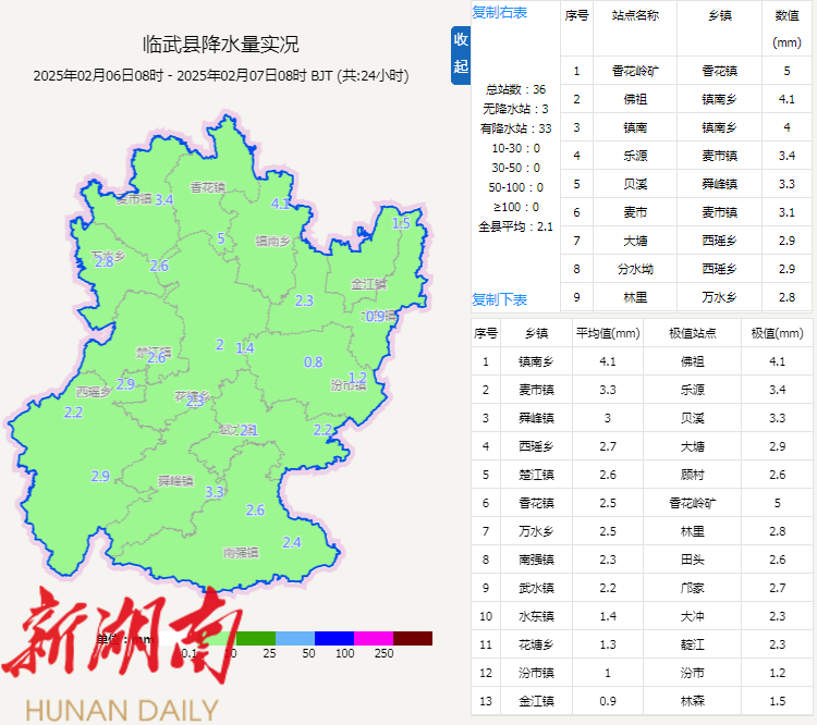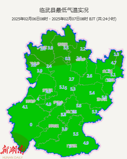 2025年2月6日08时至7日08时降雨量实况(上)和最低气温实况(下)