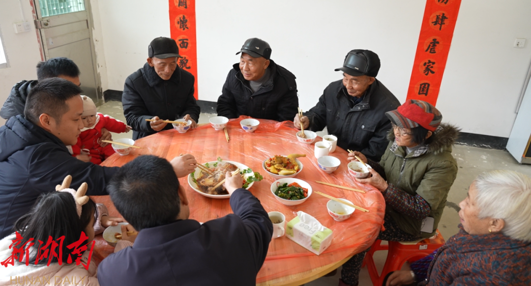 村民吴正启的新家也格外热闹,三室两厅的新房里,沙发、家电、木柜、床等一些家具摆放得整整齐齐。记者到来时,他正和家人一起贴福字。“听说我们芭蕉村要办团圆饭,湖南芳草湾生态食品科技有限公司特地送来他们的主打产品——黑山羊肉煲。我这就把菜送过去,大家红红火火地过新年。”吴正启笑着告诉记者。