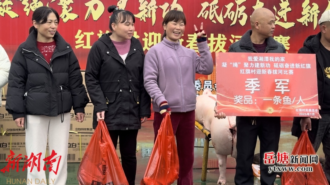 岳塘新闻网 1 月 29 日讯 (记者 郭思嘉)为进一步营造浓厚的节日氛围,丰富村民群众的精神文化生活,近日,昭山镇红旗村组织村民举办“凝‘绳’聚力建新功 砥砺奋进新红旗”2025年拔河比赛,比赛奖品年猪、土鸡、鱼成为全场最亮眼的“焦点”。