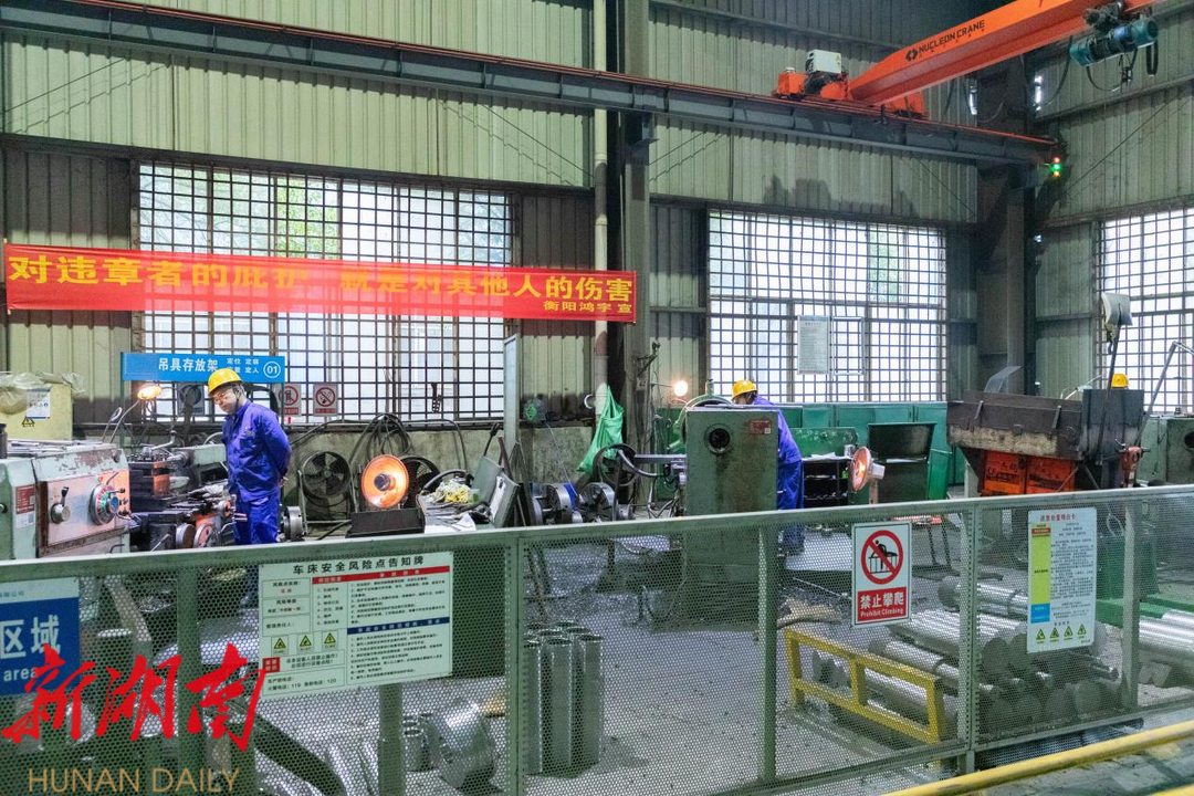 (衡阳鸿宇生产车间里工人严谨地操作着车床)