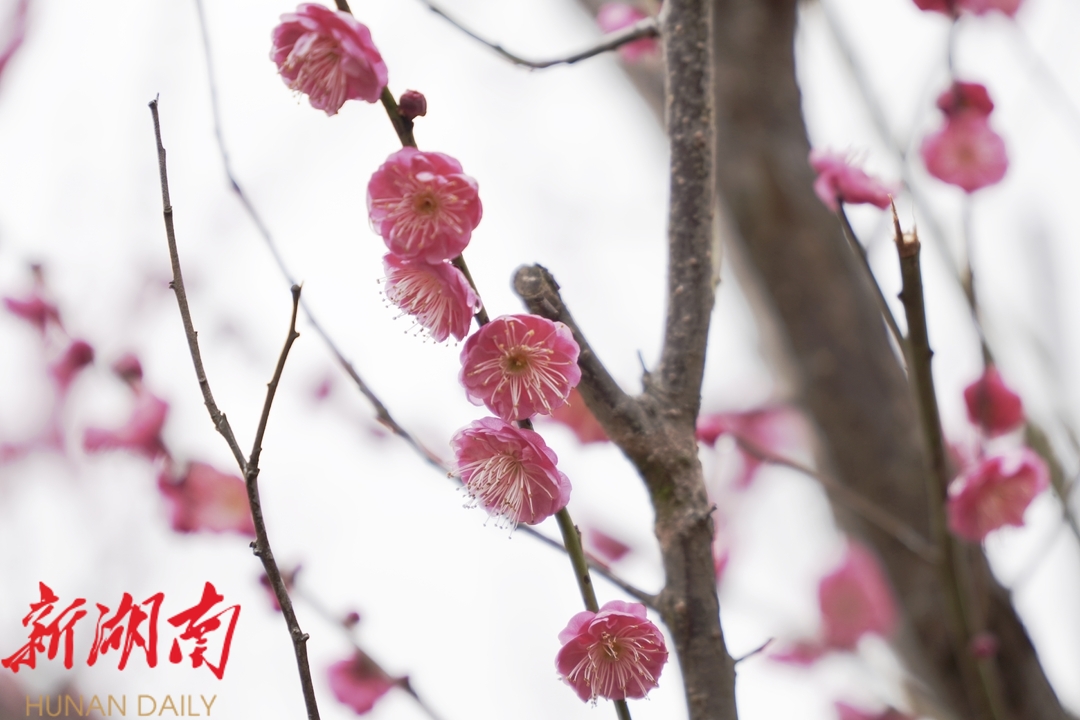 2月7日上午, 记者 在 滨江公园 看到,满园 梅花随着春风吹拂,朵朵梅花迎风摇曳,宛如一群穿着粉色纱裙的仙子,在枝头翩翩起舞。春日的梅花,花瓣更加饱满,色彩更加鲜艳,散发出淡淡的香气,让人沉醉其中。