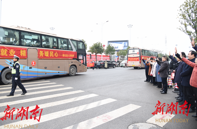 当天,出席活动领导来到招聘会现场巡展,为返岗复工人员派发政策礼包,并集体欢送新化开往广东“点对点”大巴车队发车。