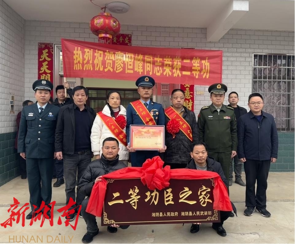 湖南日报·新湖南客户端2月11日讯(通讯员 张雅斯 晏涛)2月11日,湘阴县人武部、退役军人事务局和静河镇相关负责同志一行来到静河镇青湖村,为荣立个人二等功的廖恒锋战士家送上喜报。