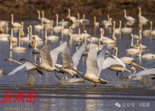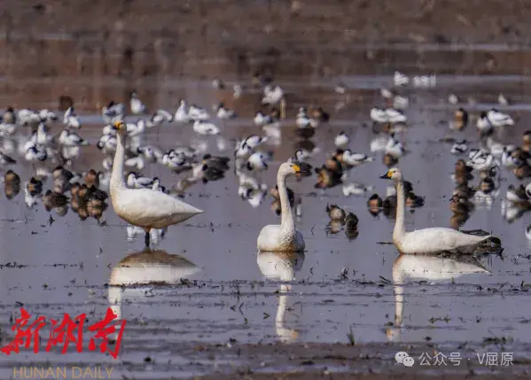 近年来,屈原管理区积极践行 “守护好一江碧水” 的理念,生态环境持续向好。东古湖湿地为候鸟提供了充足的食物资源和安全的栖息场所。连续五年来,数千只西伯利亚小天鹅已逐渐适应了这里生态环境,从过去的 “早出晚归”和“过年休假”,变为如今的 “长久定居”,全天候在东古湖 “安营扎寨”,人与自然的关系愈发和谐亲近。不仅如此,越来越多的珍稀候鸟选择在东古湖长住。除小天鹅、白鹤外,珍尾鸭、潜鸭、白骨顶鸡、反嘴鹬、黑翅长脚鹬、鹤鹬、苍鹭、白鹭等越冬候鸟达 50 多个品种,总数量超过 20000 羽,东古湖俨然成为一个 “热闹的大家庭”,更是名副其实的 “天鹅湖”。