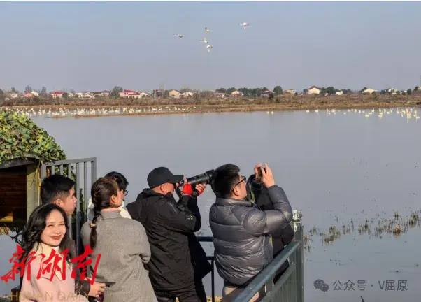 湖南日报·新湖南客户端2月11日讯(通讯员 宋政军)当新春佳节的热闹氛围随着节后复工悄然淡去,岳阳屈原管理区的东古湖景区却热度飙升,迎来一波又一波的观鸟热潮。2 月 9 日,正值正月十二,周末的暖阳洒满大地,春风轻柔送暖,东古湖景区内呈现出一幅生机勃勃的景象:百鸟翔集,天鹅嬉戏,绝美的生态奇观吸引了众多外地游客前来观赏打卡。