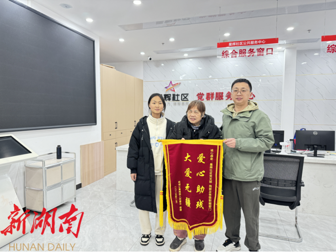 湖南日报·新湖南客户端2月11日讯(通讯员 栗稳 曹京汝)“感谢你们一直以来对我们的关心和帮助!”2月10日,长沙县泉塘街道星辉社区明城公寓小区居民郑碧云在老伴曲先生的陪伴下,将一面印有“爱心助残 大爱无疆”字样的锦旗送至社区,感激地说道:“你们尽心尽力帮我们解决难题,真是费心了!”