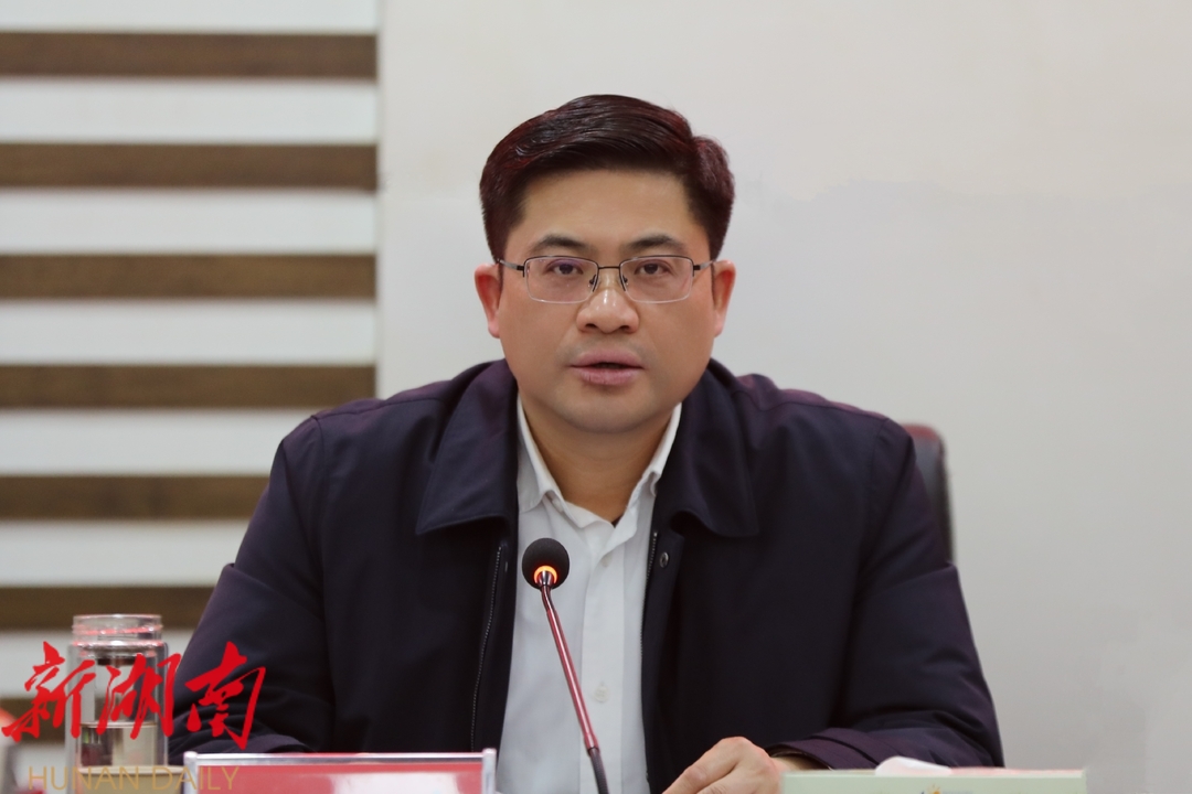 图为邵阳市人民政府党组成员、副市长、城步县委书记余勋伟在会上讲话